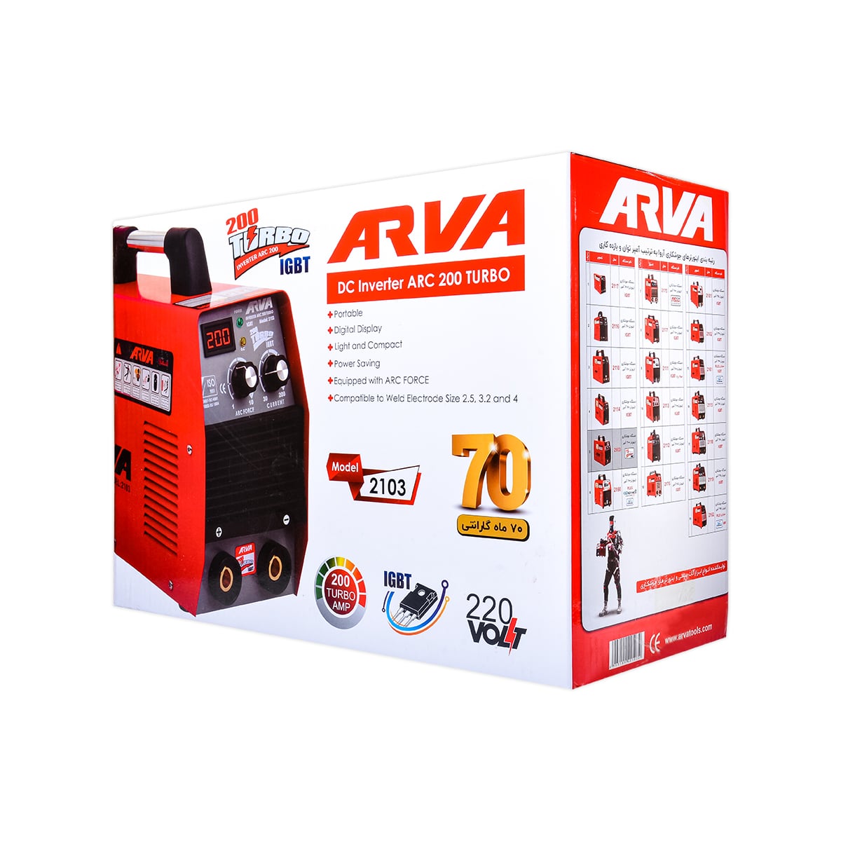 لوازم جانبی: انبر جوش و انبر اتصال به همراه کابل ولتاژ برق: تکفاز 220 ولت فرکانس: 50 هرتز جریان ورودی اسمی: 2 الی 18 آمپر جریان خروجی: 30 الی 200 آمپر ضریب توان: 0.73 چرخه کاری: 60% کارایی: 85% درجه عایق کاری: F درجه حفاظت بدنه: IP21S وزن: 5.120 کیلوگرم ابعاد دستگاه: 302×153×375 میلیمتر قطر الکترودهای مناسب: 2.5 و 3.2 و 4 نوع سوئیچ قدرت: IGBT الکترود های کاربردی: تمام الكترودهای موجود در رنج آمپر دستگاه به جز الكترودهای سلولوزی مدت گارانتی: 70 ماه مناسب برای مصارف نیمه صنعتی دارای ولوم current و arc force قابلیت جوش الکترود 4 به صورت دائم و الکترود 5 به صورت مقطعی مجهز به صفحه دیجیتال آمپر متر جهت سهولت تنظیم آمپر خروجی طراحی منحصر به فرد بدنه جهت حمل آسان صرفه جویی در مصرف برق وزن سبک و حجم کوچک