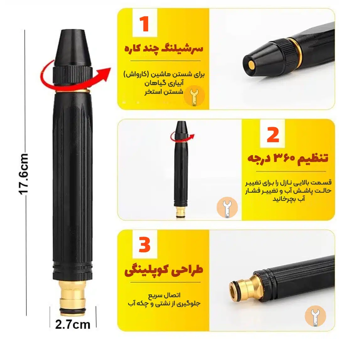 - ست کامل شامل 4 قطعه (1 نازل کارواش تفنگی + 3 کانکتور جهت اتصال شیلنگ به شیر آب و نازل