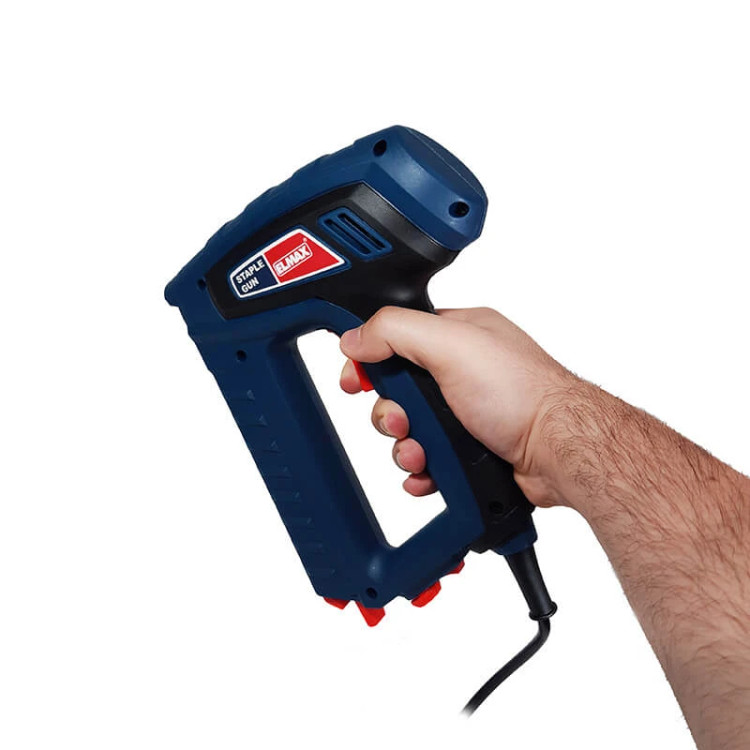 ضربه زن صنعتی با جریان ۵ آمپر قابل استفاده برای شلیک میخ و منگنه در چوب و MDF و گچ سرعت شلیک حداقل ۲۰ شلیک در دقیقه گنجایش خشاب میخ ۸۰ عدد گنجایش خشاب منگنه ۱۰۰ عدد طول کابل ۳ متر طراحی سبک و ارگونومیک دارای روکش ضد تعریق خشاب با امکان پر شدن سریع