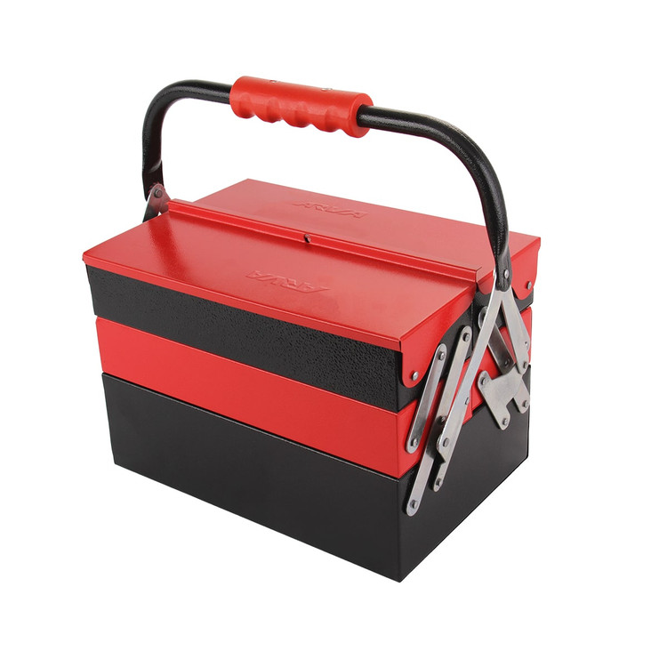 باز و بسته شدن این جعبه ابزار توسط درب اتوماتیک آن صورت می پذیرد که باعث میشود طبقات آن به راحتی باز و بسته شود. دسته جعبه ابزار آروا از جنس پلاستیکی و ABS می باشد. طراحی این جعبه ابزار به گونه ای است که تمامی ابزارآلات مد نظر را می توان درون آن قرار داد و یک جعبه ابزار ۳ طبقه بسیار کاربردی می باشد . ترکیب رنگ جعبه ابزار ۳ طبقه آروا بسیار منحصر به فرد و قرمز مشکی می باشد .
