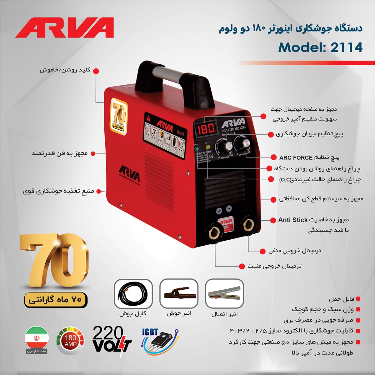 لوازم جانبی: انبر جوش و انبر اتصال قطعات فنی: سه عدد خازن، فن ۵۵۰۰ دور ولتاژ برق: تکفاز ۲۲۰ ولت فرکانس: ۵۰ الی ۶۰ هرتز جریان ورودی اسمی: ۲ الی ۱۸ آمپر جریان خروجی: ۲۰ الی ۱۸۰ آمپر ضریب توان: ۰.۷۳ درجه عایق کاری: F درجه حفاظت بدنه: IP۲۱ وزن: ۳.۶۵ کیلوگرم ابعاد دستگاه: ۲۷۰×۱۲۰×۳۰۰ میلیمتر قطر الکترودهای مناسب: ۲.۵ و ۳.۲ و ۴ نوع سوئیچ قدرت: IGBT الکترود های کاربردی: تمام الكترودهای موجود در رنج آمپر دستگاه به جز الكترودهای سلولوزی مدت گارانتی: ۷۰ ماه مناسب برای مصارف خانگی دارای ولوم current و ولوم arc force قابلیت جوش الکترود ۲.۵ و ۳.۲ به صورت دائم و ۴ به صورت مقطعی مجهز به تکنولوژی PWM، سیستم قطع کن حفاظتی فوق هوشمند مجهز به صفحه دیجیتال آمپر متر جهت سهولت تنظیم آمپر خروجی طراحی منحصر به فرد بدنه جهت حمل آسان
