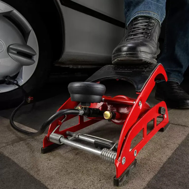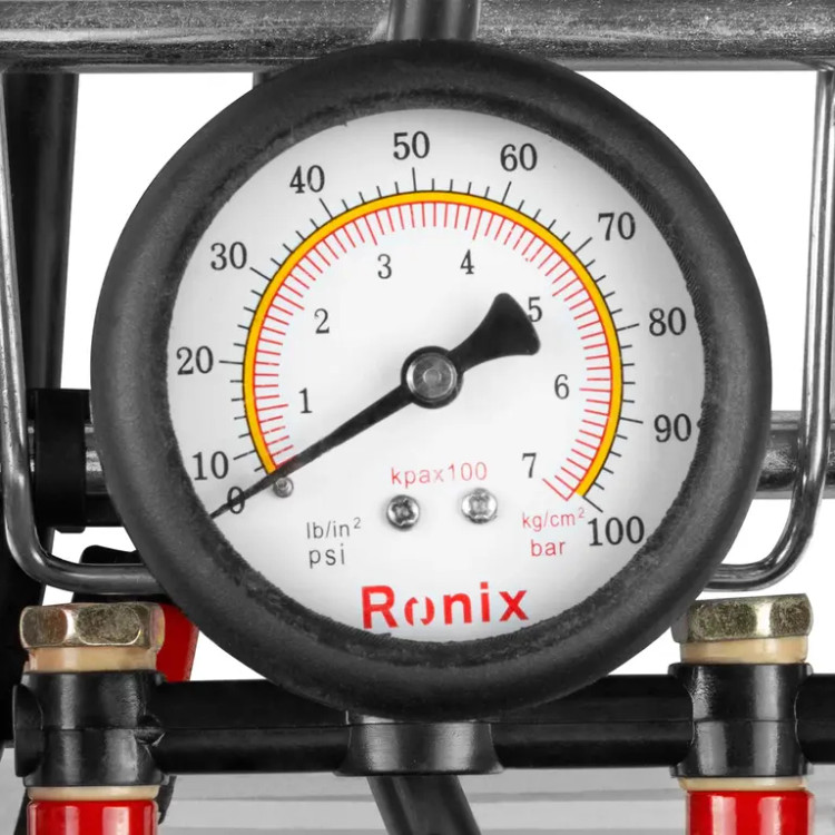 گیج فشار روی این تلمبه پایی رونیکس امکان کنترل فشار باد را فراهم کرده و گیره ایمنی پدال از بیرون پریدن ناگهانی پمپ جلوگیری میکند و باعث ایمنی کاربر میشود